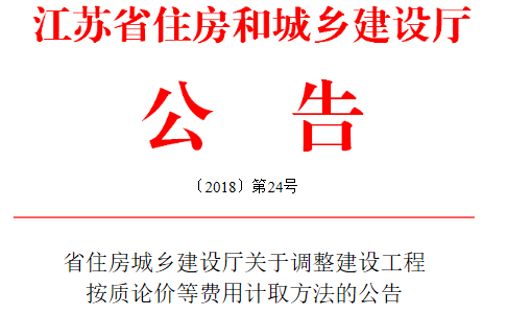 为贯彻落实《国务院办公厅关于促进建筑业持续健康发展的意见》(国办发〔2017〕19 号)、《国务院关于印发打赢蓝天保卫战三年行动计划的通知》(国发〔2018〕22号)、《省政府关于促进建筑业改革发展的意见》(苏政发〔2017〕151号)等文件要求,鼓励工程建设各方创建优质工程,建立优质优价制度,加强建筑工地扬尘污染防治,现就《江苏省建设工程费用定额》(2014年)中的工程按质论价、安全文明施工、工程排污费等费用计取方法调整的事项公告如下。
