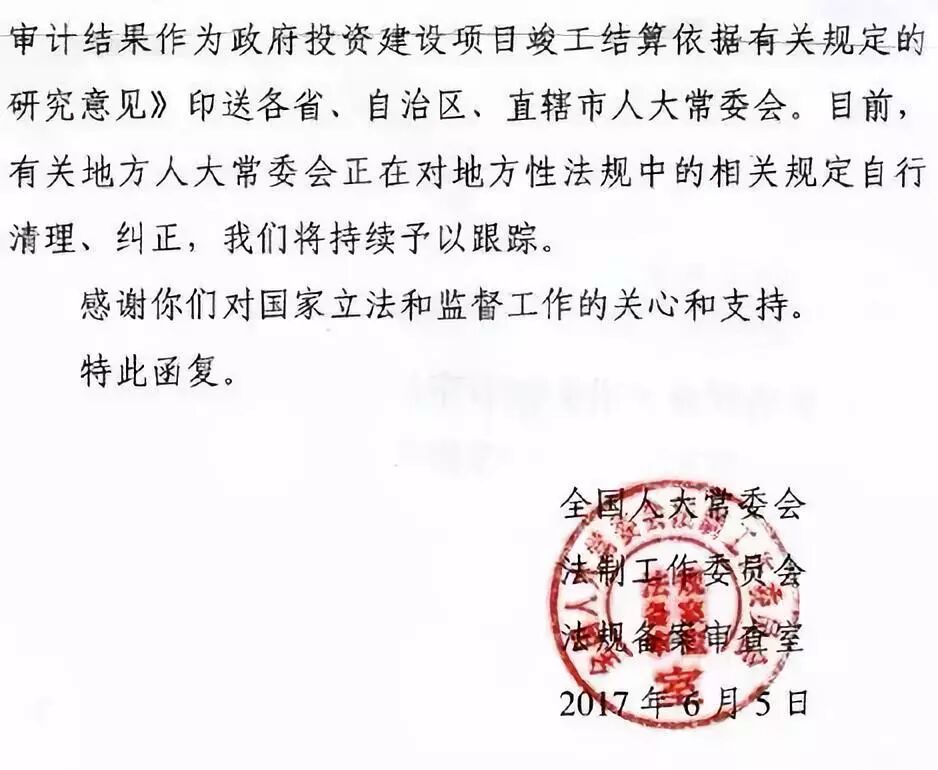 2013年,中建协联合26家地方建筑业协会和有关行业建设协会两次向全国人大常委会申请对规定“以审计结果作为工程竣工结算依据”的地方性法规进行立法审查,并建议予以撤销。 2015年5月中建协再次向全国人大常委会法工委提交申请,进一步说明这一地方性法规给施工企业造成的经济损失,引起了法工委的高度重视。 2月22日,法工委印发《对地方性法规中以审计结果作为政府投资建设项目竣工结算依据有关规定的研究意见》,要求各省、自治区、直辖市人大常委会对所制定或者批准的与审计相关的地方性法规开展自查,对有关条款进行清理纠正。 6月5日,法工委复函《关于对地方性法规中以审计结果作为政府投资建设项目竣工结算依据有关规定提出的审查建议的复函》。该复函提出,经过充分调研和征求意见,认为地方性法规中直接以审计结果作为竣工结算依据和应当在招标文件中载明或者在合同中约定以审计结果作为竣工结算依据的规定,限制了民事权利,超越了地方立法权限,应当予以纠正。 目前,此项工作各地现已完成自查,对相关条款的清理修订工作亦在抓紧落实。